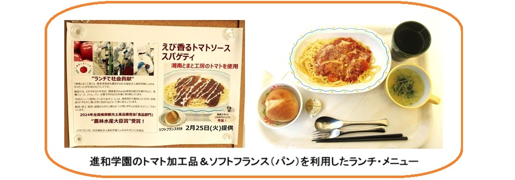 2025年2月25日、Honda和光ビルの社員食堂では、進和学園の自主製品を利用した「えび香るトマトソーススパゲティー」がランチ・メニューの一品として提供されました。添えられるパンも学園が手掛けた「ソフトフランス」です。