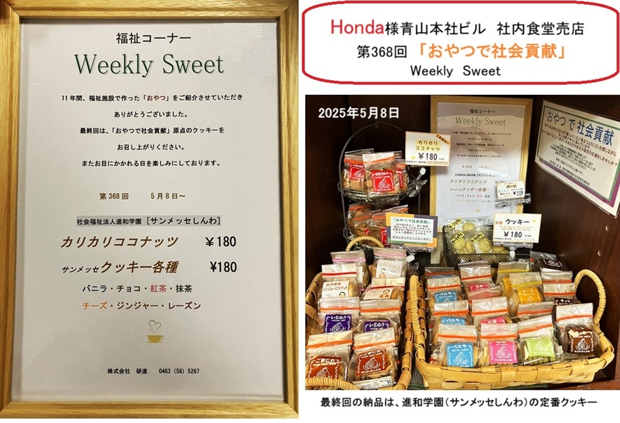 青山本社ビルは、建替えのため2025年3月末で1階のCafeは休館となり、社内食堂売店も5月に閉店となりました。2025年5月8日、第368回「おやつで社会貢献」をもって、菓子類のお届けは最終回を迎えました。11年間に渡り、Honda社員の皆様に、福祉施設の手作り菓子類をご利用頂きましたこと、心より感謝申し上げます。自主製品に従事する障害者ご本人の働き甲斐に繋がり、職員、並びに関係者一同にとりましても大きな励みとなりました。