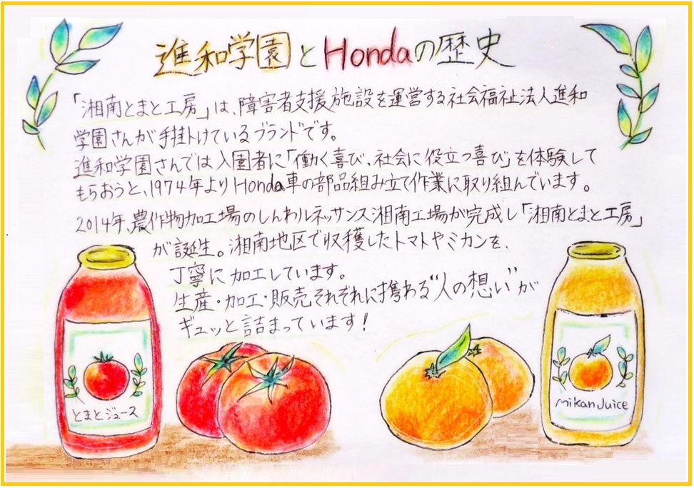 青山本社1階のMILES Honda Cafeにおいては、菓子類の他、進和学園(しんわルネッサンス)の農産品加工「湘南とまと工房」のトマト&ミカンジュースも合わせ、一般のお客様にご提供頂いています。作業に従事する障害のある方々の大きな励みとなり働き甲斐にも繋がっています。