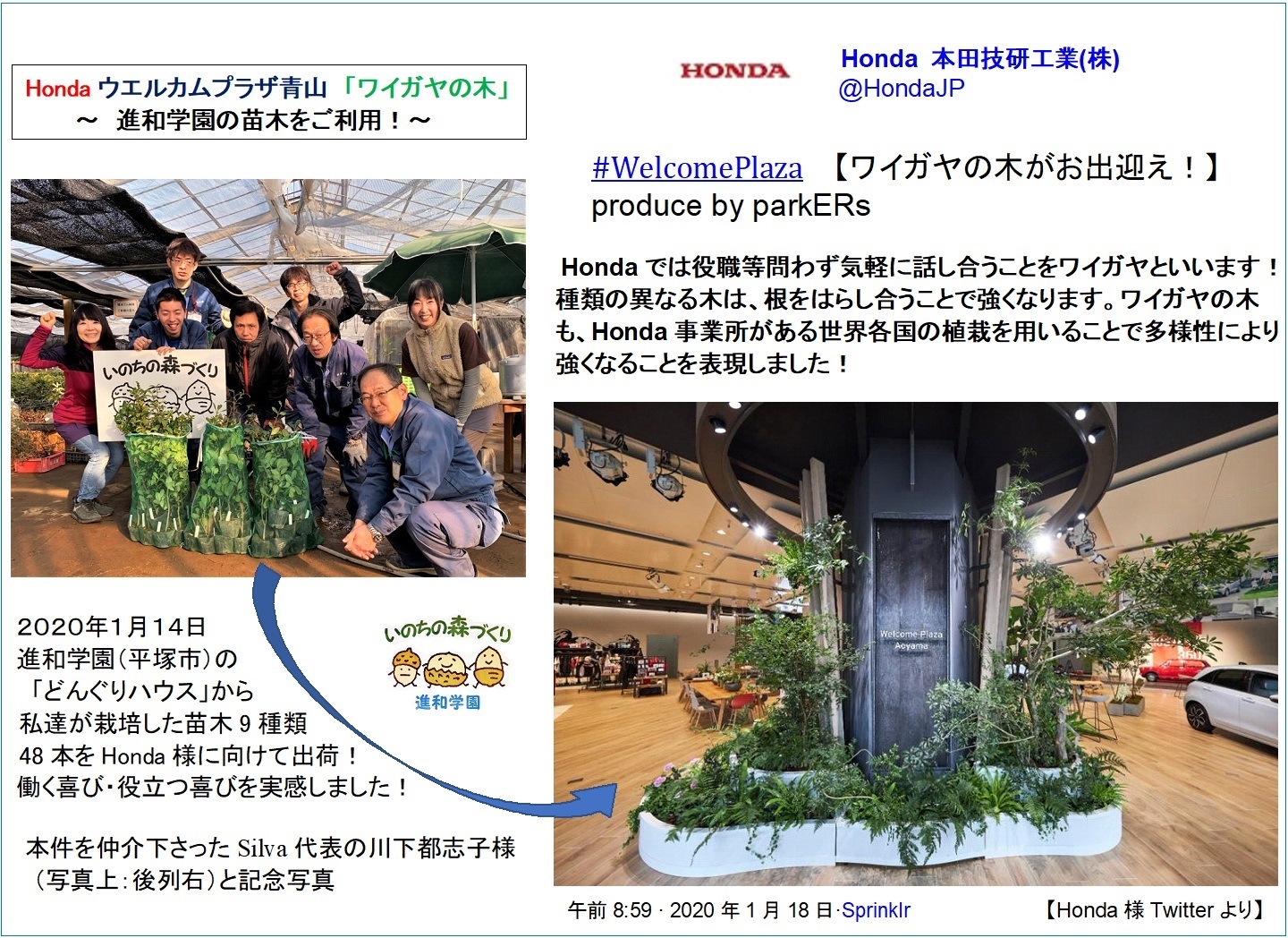 また、Honda様の社員食堂において、進和学園自主製品(パン類、野菜類、農産加工品)を、メニューとしてご利用頂くイベントを企画・実施下さる等、親身なるご指導ご支援を賜っています。心より感謝申し上げます。