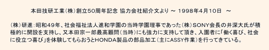 本田技研工業 西田通弘副社長(当時)の「授産施設に仕事を発注することは、企業の社会的責任であると思う」とのコメントが45年以上前のものであることに驚かされます。