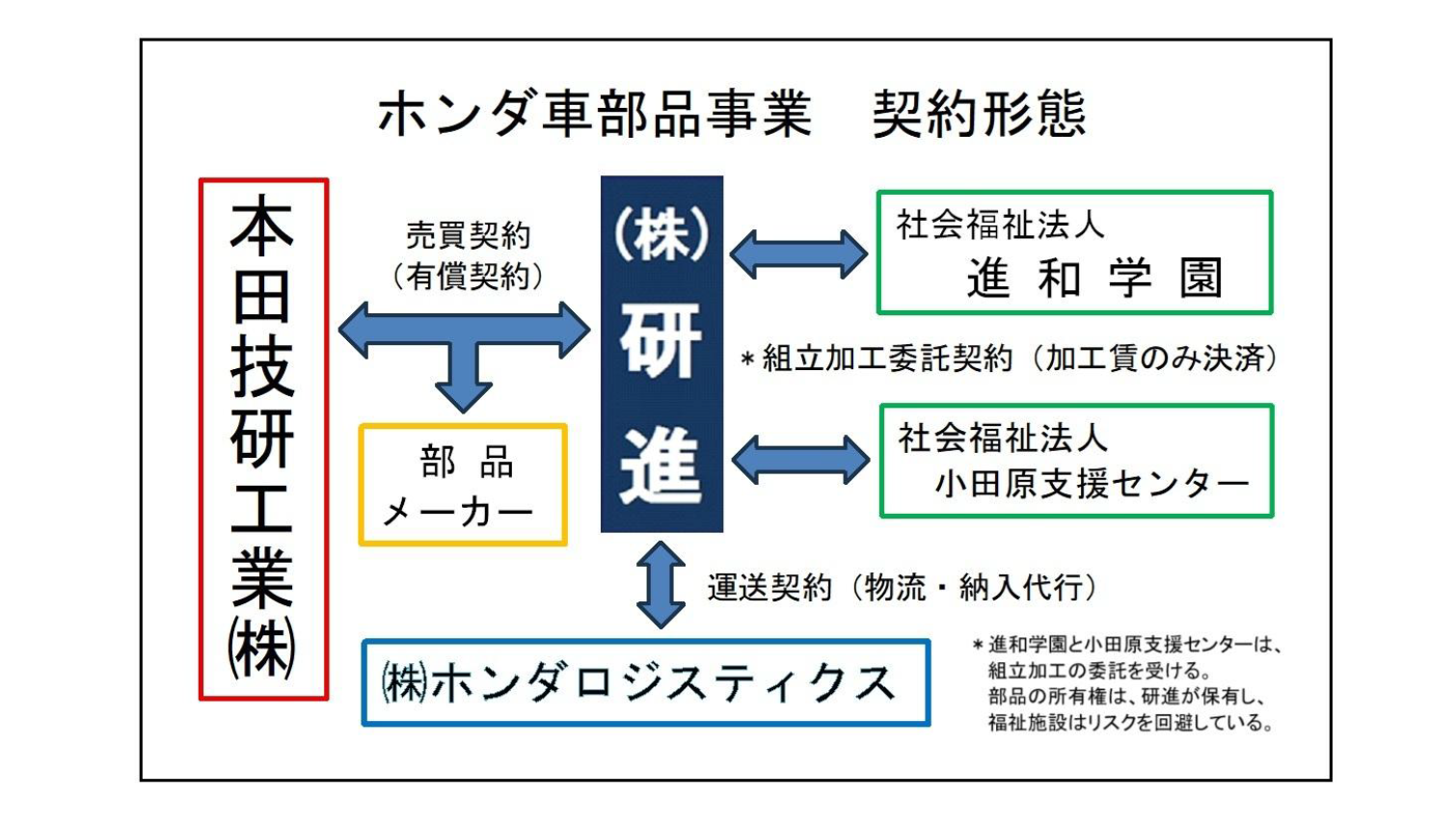 (株)研進は、本田技研工業(株)様(発注事業者)と売買契約・部品取引基本契約(有償契約) を締結して、部品支給メーカー様から部品を購入し、組立加工を行った完成部品をHonda 様の生産計画に合わせて各製作所(埼玉・鈴鹿)に納品しています。