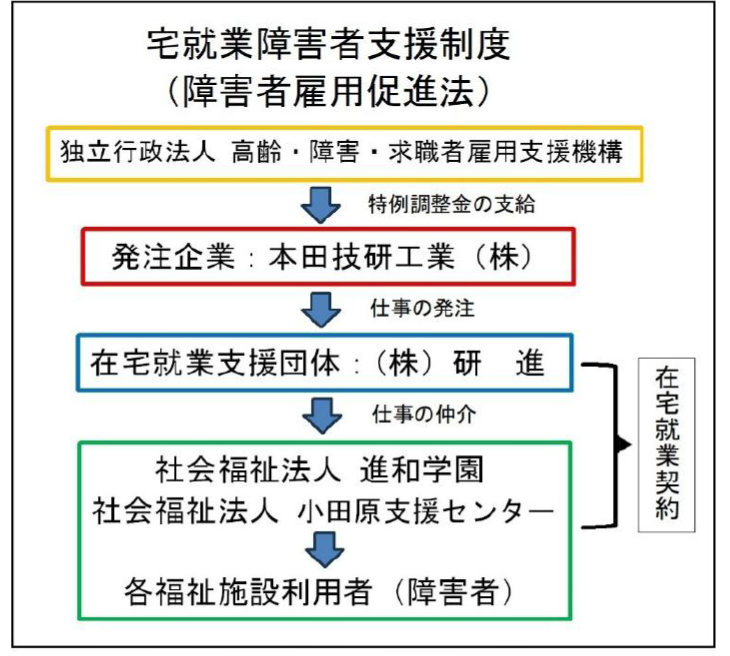 同様に、研進と社会福祉法人小田原支援センター(B型事業者)利用者約30名/同センターとの三者間で、本制度に基づく在宅就業契約を締結しています。