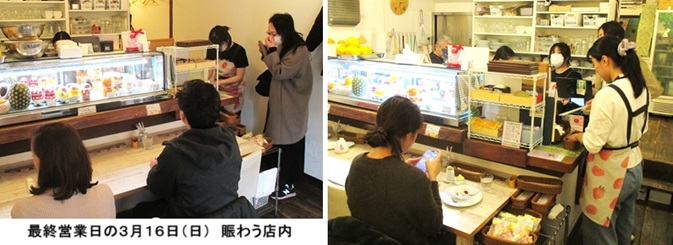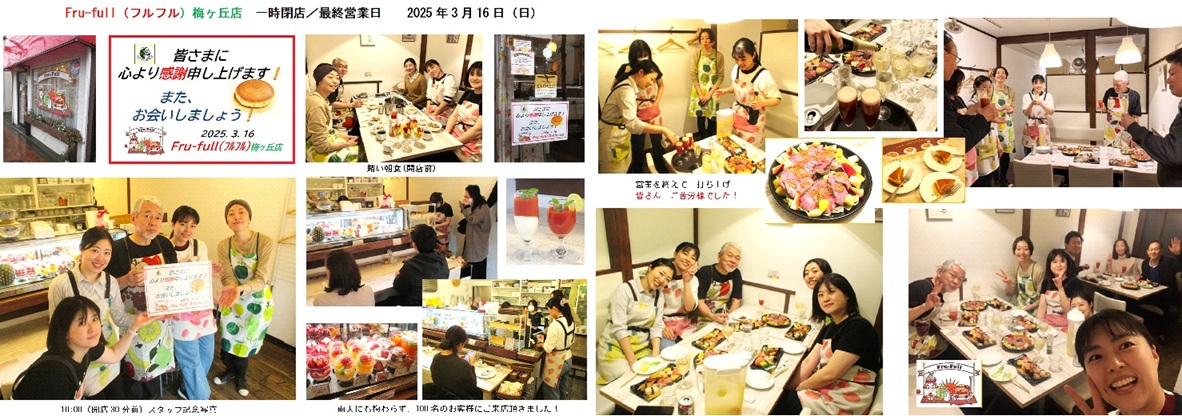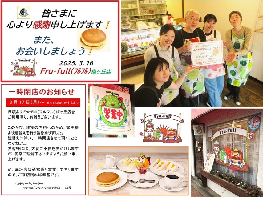 私達と提携関係にあるホットケーキパーラーFru-Full(フルフル)さんの梅ヶ丘店は、建物の老朽化に伴う建替えのため、一時閉店となります。最終営業日を迎えた2025年3月16日(日)、朝からの冷たい雨模様にも拘わらず、大勢のお客様にご来店頂きました。店内には「皆さまに心より感謝申し上げます!また、お会いしましょう!」と掲示が貼られ、お客様の中には、閉店を惜しんで写真に撮られる方も・・・!
