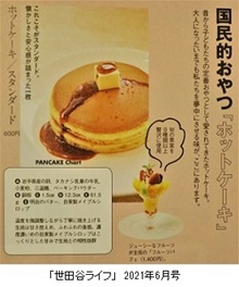 フルフル梅ヶ丘店の伝統のホットケーキが紹介されています。「国民的おや