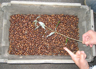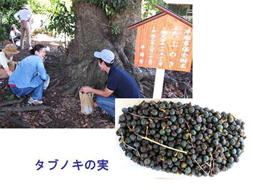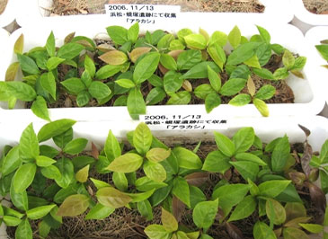私達は、平塚市の柳町西公園の保存樹をはじめ何本かの母樹を見廻り、タイミングを逸しないようにタブノキの実を拾っています。収集した実は、水に漬けてふやかし表皮を剥いてからトロ箱に撒きます。発芽までは比較的早く、9~10月には可愛い芽が次々に出てきます。秋に収集するドングリは、5月頃からポットに移しますが、タブノキのポット苗づくりは秋となります。