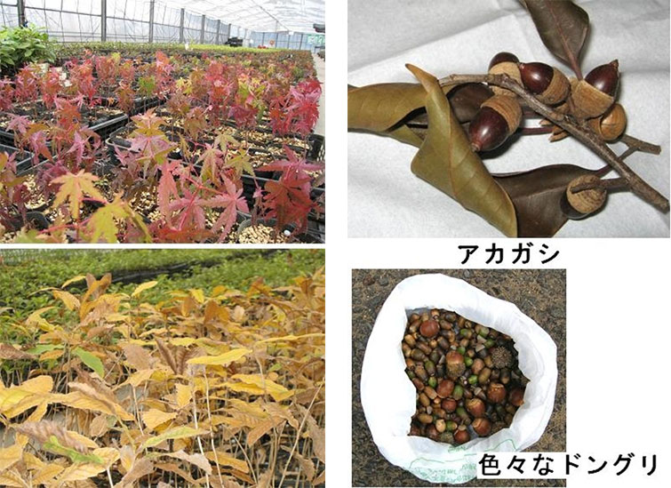 「どんぐり」以外にも、広葉樹の種や実を採集して育苗箱に蒔いています。写真は真っ赤に色付いた「アオキ」の実です。進和学園の周辺の自然林にはこの低木広葉樹の代表種である「アオキ」がたくさん見られます。