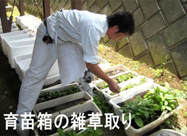春になると育苗箱には雑草も生えて来ます。「どんぐり」の芽と間違えないように雑草を取り除きます。