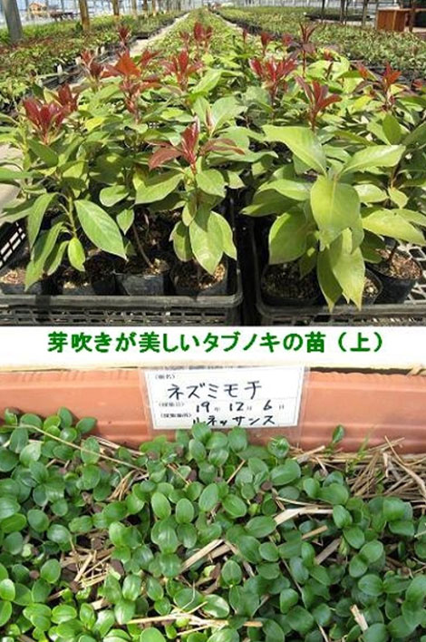 前年秋に実を蒔いた育苗箱でも大きな変化が・・!ネズミモチも発芽し、可愛い艶のある双葉で太陽の光を精一杯受け止めています。