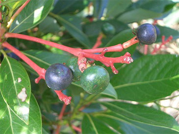 常緑高木の代表種「タブノキ」は、ドングリではなく、1cm程度の実が春から夏にかけて結実し7月頃に落ち始めます。実が付く枝先は美しい紅色の柄を形成するので、実が付いているか否かは容易に判断できます。最初は緑色の実もやがて黒色に熟する頃には、鳥達のご馳走にもなります。