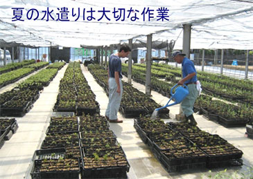 夏は、苗が最も成長するシーズン。太陽光を浴びて光合成が活発となります。若葉が次々に出て来る様子は自然のエネルギー、「命」の尊さ・たくましさを感じさせてくれます。栽培のポイントは「水遣り」。少なくても多すぎてもダメ。木は「根」で勝負します。「水遣り」の良否が「根」の成長を左右します。