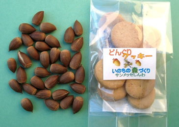 「サンメッセしんわ」及び(株)研進では「いのちの森づくり」プロジェクトの一環として、しいの実(スダジイ)から「どんぐりクッキー」を作っています。