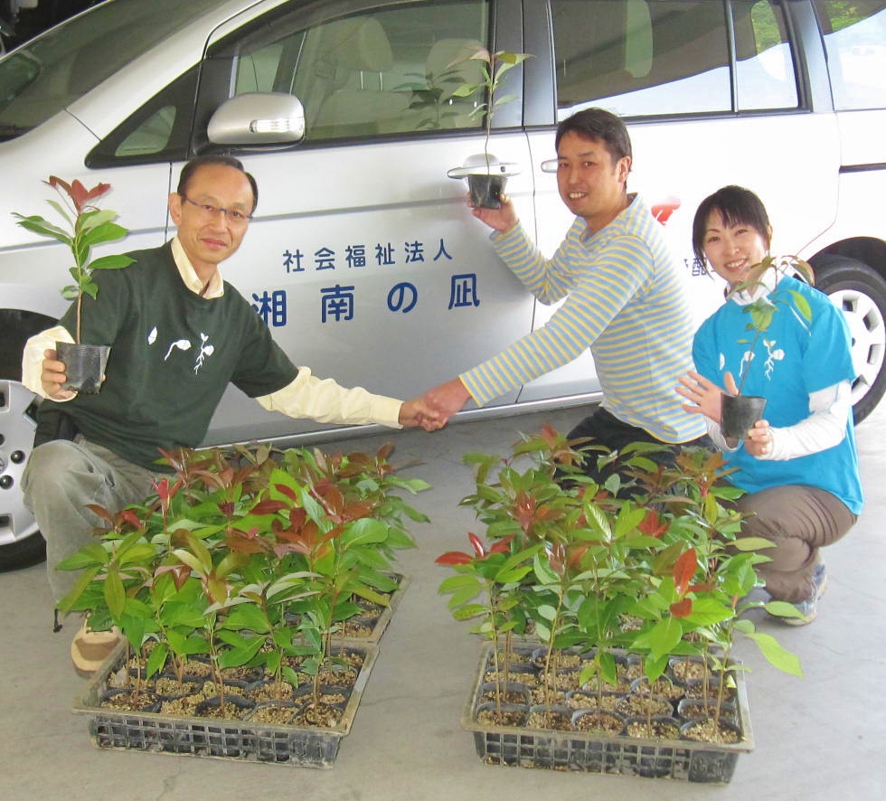 2013年5月4日、湘南国際村めぐりの森植樹祭を控え、湘南の凪の皆さんが育てたタブノキの苗80本がめでたく出荷されました。その後も湘南国際村めぐりの森を中心に、苗木の提供についてサポート頂いています。
