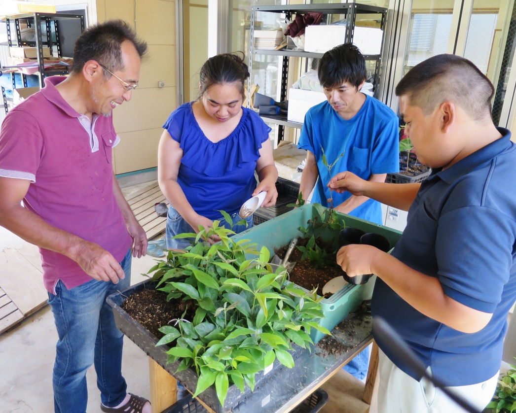 私達から他の福祉施設に、苗木の栽培を委託し作業メンバーの工賃に還元する「苗木の栽培委託スキーム」を導入しています。研進スタッフが、知識やノウハウを提供し、栽培上の技術指導をさせて頂きます。