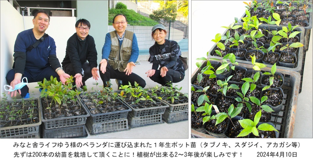 社会福祉法人みなと舎ライフゆう様(横須賀市)より、苗木の栽培を行いたいとのご希望を受け相談の結果、2024年4月より、苗木の栽培委託を開始。同施設は、医療型障害児者入所施設・療養介護事業を担われ、重度障害のある方、車椅子ご利用の方も多いのですが、苗木の栽培が皆様の楽しみとなり、少しでもプラスになれば幸甚です。