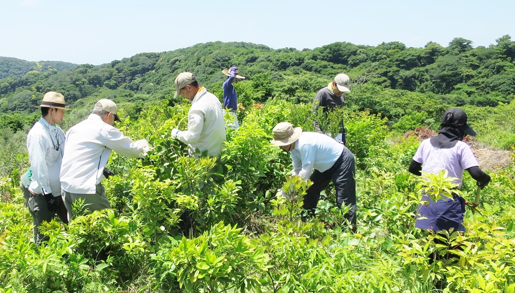 植樹から10年が経過し、外来種のトウネズミモチや隣接して植えられたキョウチクトウ等が徒長し、また、台湾リスの食害もあって自然の森の生長が妨げられていました。