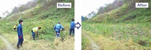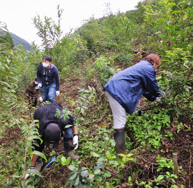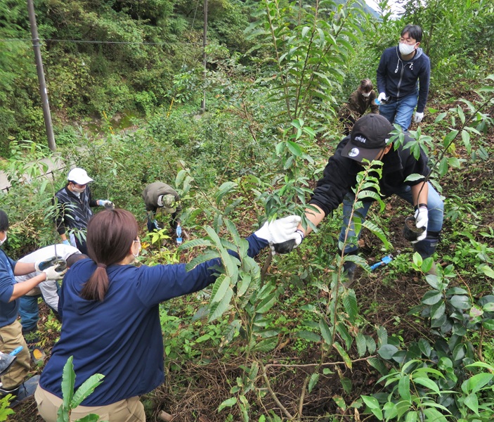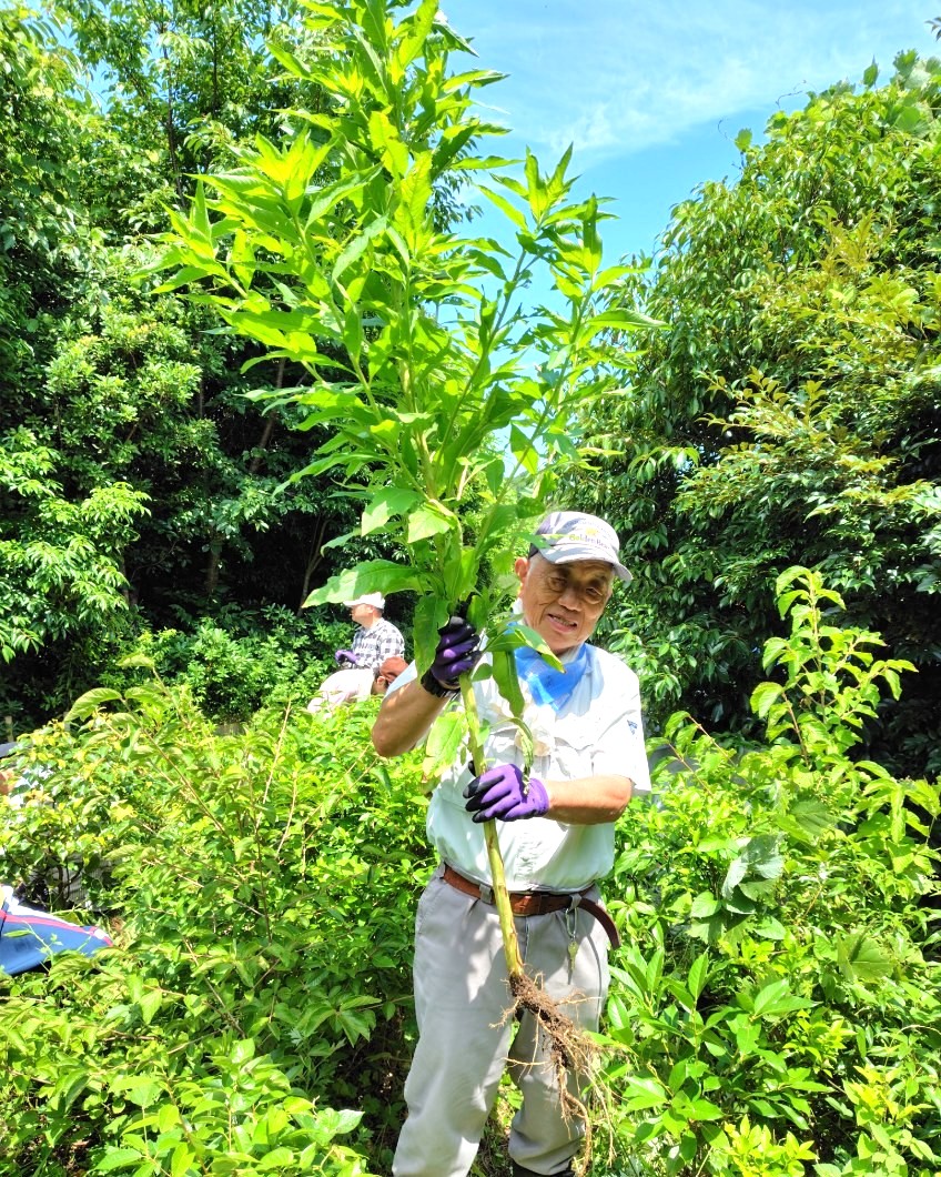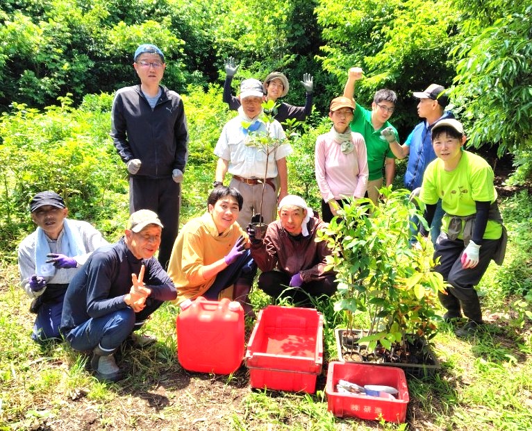 また、植樹後2~3年間は、雑草の生長により日照が遮られたり、つる性植物の被圧により苗木の生長が阻害されるため、定期的な育樹(除草)作業が必要となります。自然淘汰に任せられる樹高1.5~2m以上に達するまでの間、育樹作業を有償で「どんぐりブラザーズ」の皆さんにお願いし一緒に作業に励んでいます。