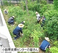 近年、夏の猛暑が大変ですが、屋上にある育苗場には、遮光幕を設置し対策を講じています。湘南の凪の皆さんとは、B型事業所の「mai!えるしい」のメンバーも参加して、湘南国際村めぐりの森及び逗子第一運動公園の育樹・保全(除草・剪定・補植)作業でも協働体制をとっており、親しく交流を図っています。心強い「森づくり」の仲間です。