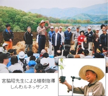 宮脇先生には、2006年4月、福祉工場「しんわルネッサンス」植樹祭(52種類4,888本)を、また、2009年6月、生活介護施設「進和万田ホーム」植樹祭(52種類3,440本)を直々にご指導頂きました。宮脇方式(混植・密植)により植樹した上記2施設を囲む木々は、今では、素晴らしい「森」に生長し、私達の活動を見守ってくれています。