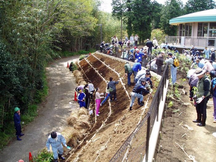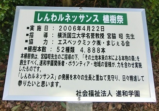 2006年4月22日、宮脇先生のご指導により「しんわルネッサンス」における植樹祭が行われました。進和学園の利用者ご本人、ご家族、職員、地域の皆様、「まじぇる会」様はじめボランティアの方々など570人程に参加頂きました。