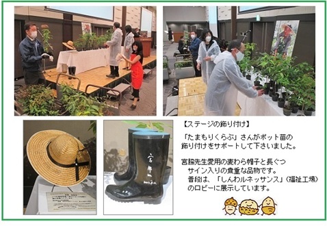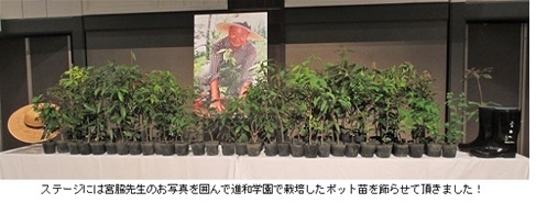 先生にご指導を仰ぎ、また、親交のありました皆様、学会、行政、教育、企業、ボランティア・・・各界より多彩な方々が臨席されました。会場に掲げられた先生のお写真を取り囲むように、進和学園で栽培した苗木を飾らせて頂きました。先生がご存命であれば94才になられることから、シイ・タブ・カシ類・・色々な種類のポット苗を混ぜて94本を用意しました。