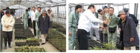 2008年3月10日、宮脇昭先生(横浜国立大学名誉教授)が、進和学園の「どんぐりハウス」に来訪され、苗木の栽培状況をご視察されました。「土は、もっとこんもりと盛った方が良いですね」「水の遣り過ぎには注意して下さい」・・・とご丁寧にアドバイスを賜ると共に私達の取り組みを激励して下さいました。
