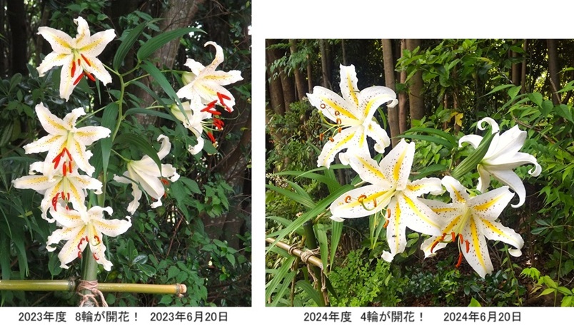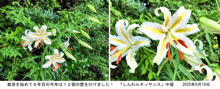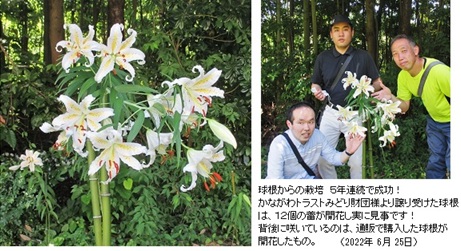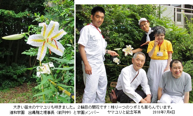 2017年11月、財団専務理事の西ヶ谷孝之様より、自生種の「ヤマユリ」の球根、木子(小球根)及び種子を譲り受け、福祉工場「しんわルネッサンス」の中庭に植えて栽培を始めました。宿根草の「ヤマユリ」が生長して開花することは容易ではないと思っていましたが、幸いにも、球根からの栽培は2018年から2023年の6年連続で開花に成功しました!大輪のヤマユリの花の美しさと芳醇な香りは格別で、私達に感動をもたらしてくれます。詳しくは、後掲の記事と栽培記録をご覧下さい。