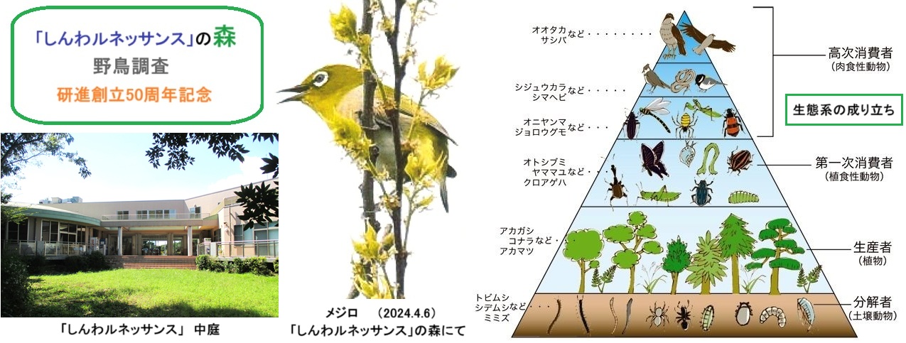 本年度、研進創立50周年の節目を迎え、ご縁あって太平電機(株)様のECOひいきプロジェクトのご協力を得て、記念事業の一環として、「しんわルネッサンス」の森の周りに集まる野鳥達の調査を行うこととしました。「いのちの森づくり」と合わせ、生物多様性を尊重した自然環境保全の活動を拡げようと考えた次第です。