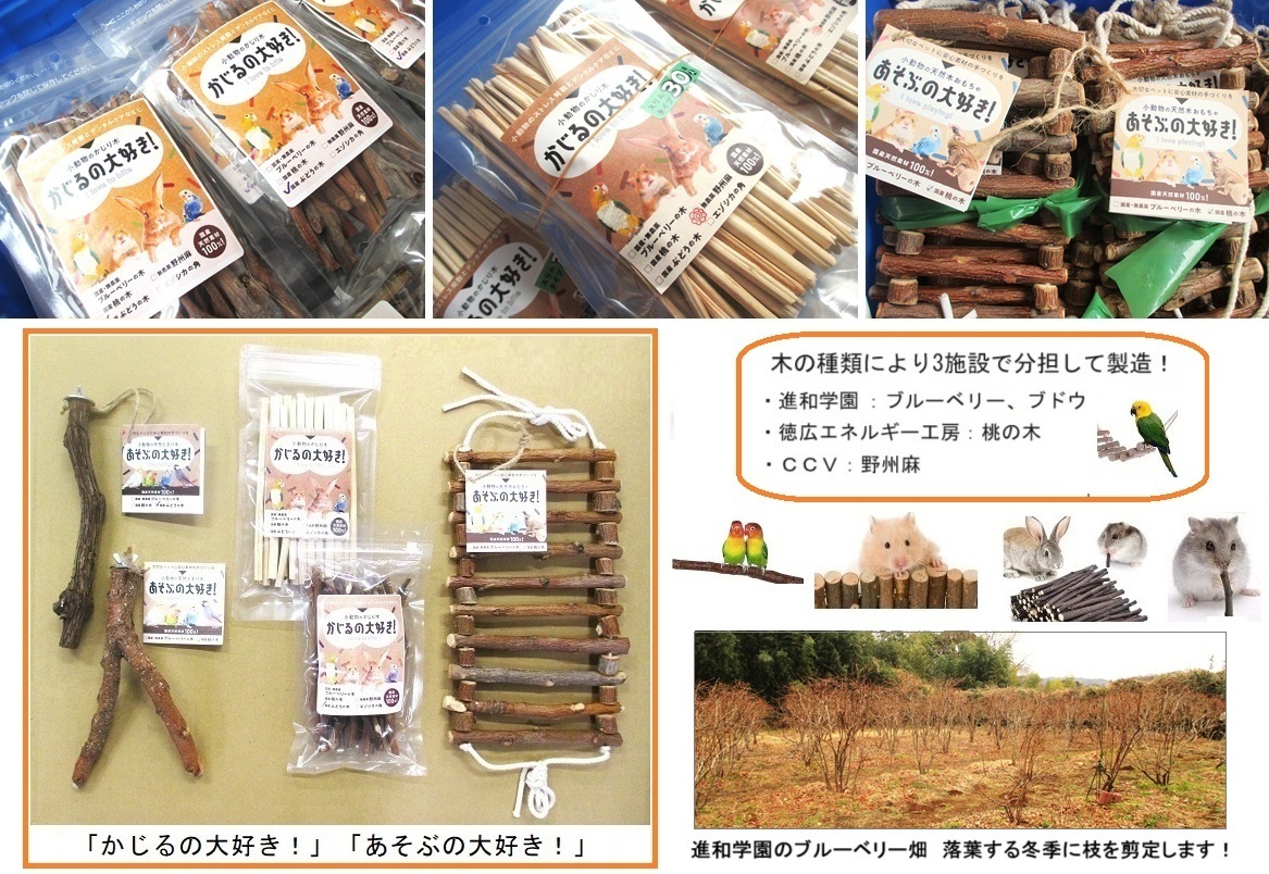 本商品は、羽塚順子様(MotherNess Publishing代表)の仲介で、一般社団法人徳広エネルギー工房(長野県大町市)及びNPO法人CCV(栃木県鹿沼市)と研進・進和学園が連携して製造・販売しています。3施設で分担して、現在、桃、ブドウ、ブルーベリー、野州麻の4種類の樹種を取り揃えています。ブルーベリーについては、進和学園が無農薬で栽培しているブルーベリーの剪定枝を活用しており、原価率においても有利な自主製品として期待されています。