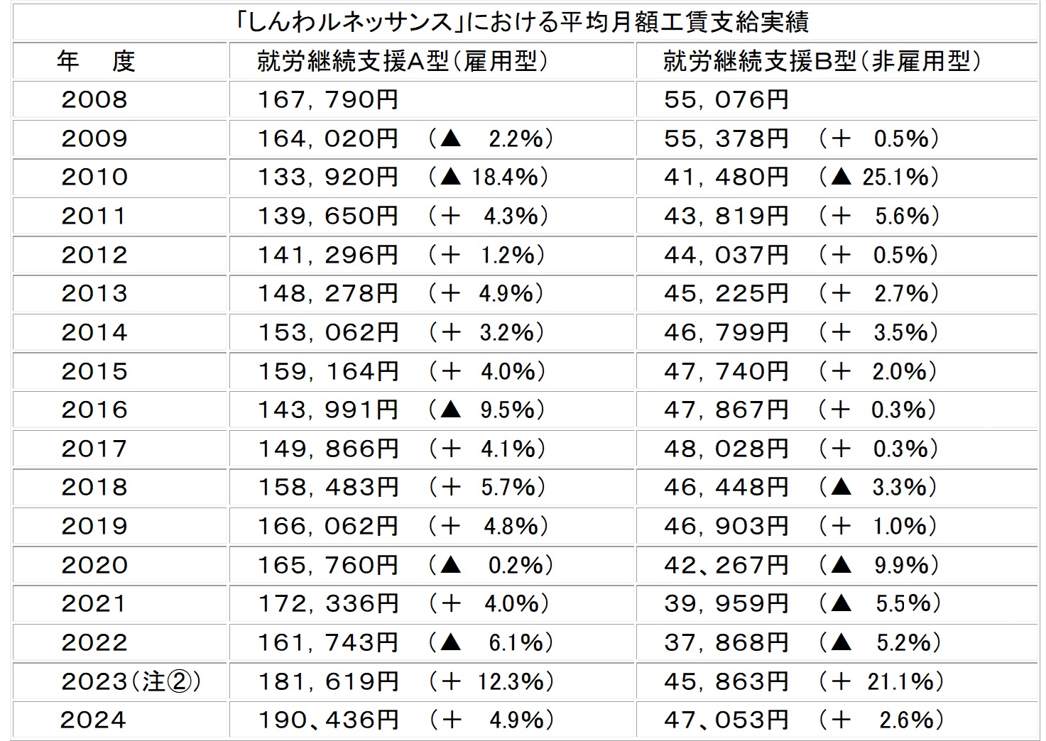 ②2023年度より、平均月額工賃の計算方法が改定されました。従来、利用登録者全員を母集団に含めていましたが、