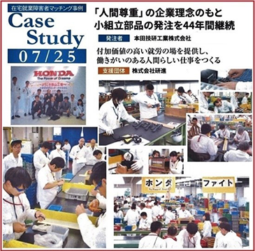 弊社は、進和学園の営業窓口として、永年に亘り本田技研工業(株)様より仕事をご発注頂き、多くの障害のある方々の就労支援に注力して来ました。本制度を活用して発注企業であるHonda様に、2008年度より、自動車メーカーで唯一、特例調整金が支給されています。