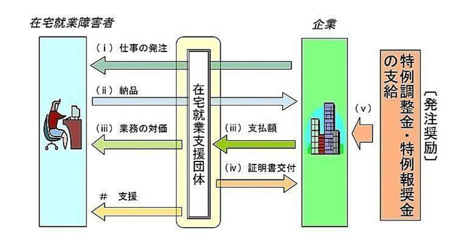 障害をお持ちの方が自宅で就業する場合の他、福祉施設等で働く方々に仕事を発注する企業に対して、障害者雇用納付金制度に基づき、特例調整金・特例報奨金が支給される制度です。
