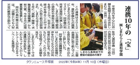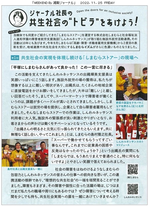 湘南・平塚の有名スーパ-しまむらストアー様における進和学園メンバーによる「施設外就労」は、お陰様で10周年を迎えました。地域情報誌「WEEKEND By 湘南ジャーナル」(2022.11.25)が、「ジャーナル社長の共生社会のトビラをあけよう!」コラムの第1回として本件を取り上げています。しまむら様と進和学園の連携を「理想的な共生社会」の一端を垣間見る・・と高くご評価頂いています