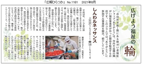 平塚市が発行する「広報ひらつか」(2021年8月)のコラム「広げよう福祉の輪」において、進和学園の就労支援施設「しんわルネッサンス」が紹介されました。