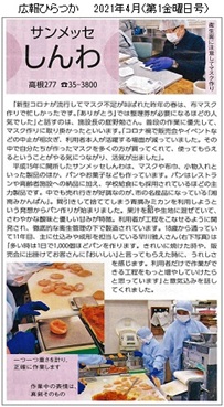 「わが街の素敵なお店・会社の紹介」というコーナーで、「サンメッセしんわ」が、「福祉だから」といった甘えを排し、市場に通ずる味と品質を追求して商品開発に取り組み、「逸品」(注)との評価を獲得した「湘南みかんぱん」の誕生の経緯が掲載されています。製パンに従事するメンバーの明るい笑顔が溢れる写真からは元気が伝わって来ます。