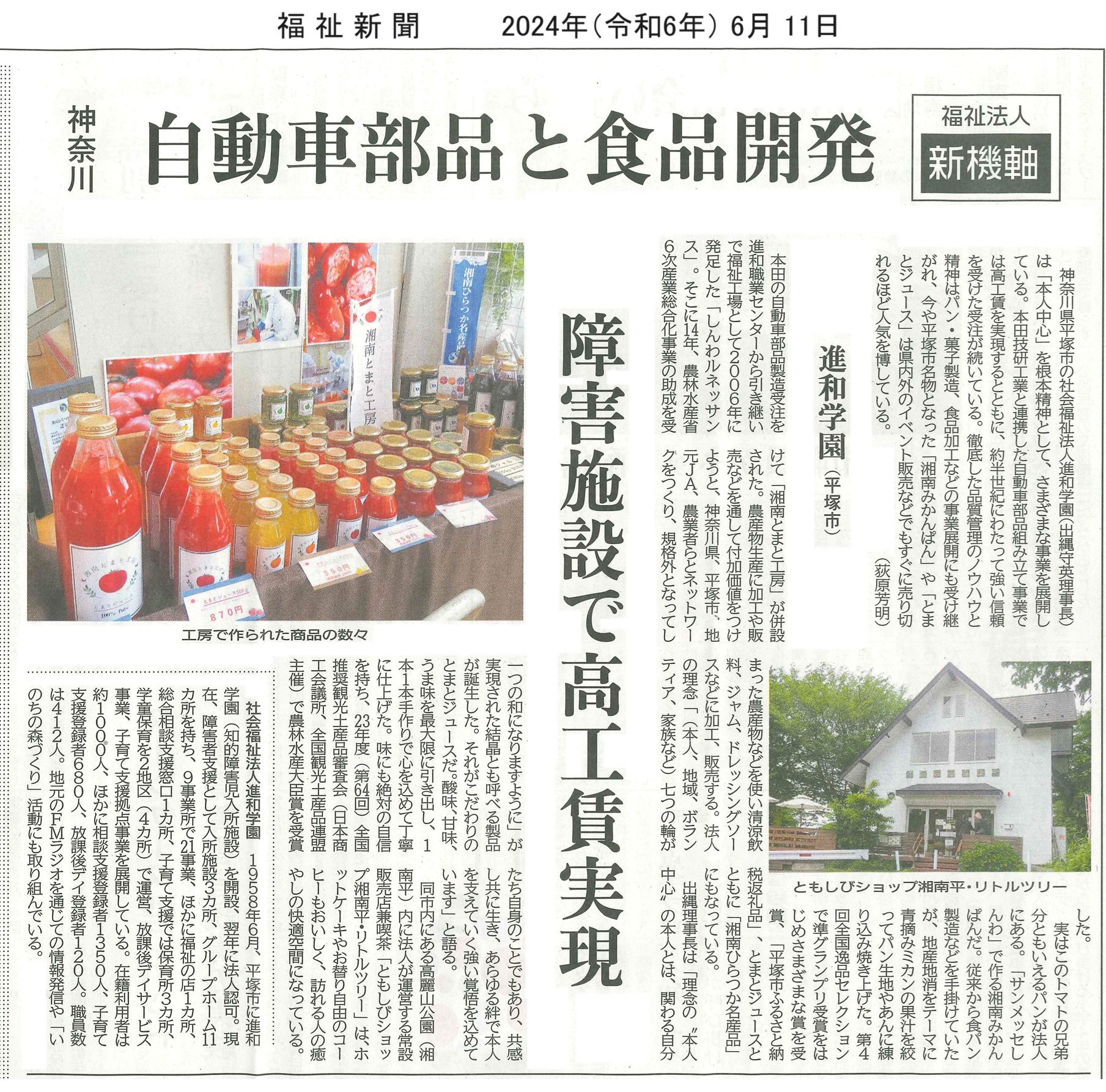 社会福祉界の専門紙・福祉新聞(2024年6月11日)に、進和学園の取り組みが紹介されました。半世紀に及ぶホンダ車部品事業により、高い工賃実績を実現すると共に、品質保証やモノづくりのノウハウを他の作業種にも受け継いでいることを報じています。特に、ヒット商品となっている「湘南みかんぱん」や「湘南トマトジュース」は高く評価され、様々な賞も受賞していることを紹介。「自動車部品と食品開発/福祉法人・新機軸」との見出しが、進和学園がこれまで取り組んで来た軌跡と新たな展開への挑戦を端的に表しているように感じます。