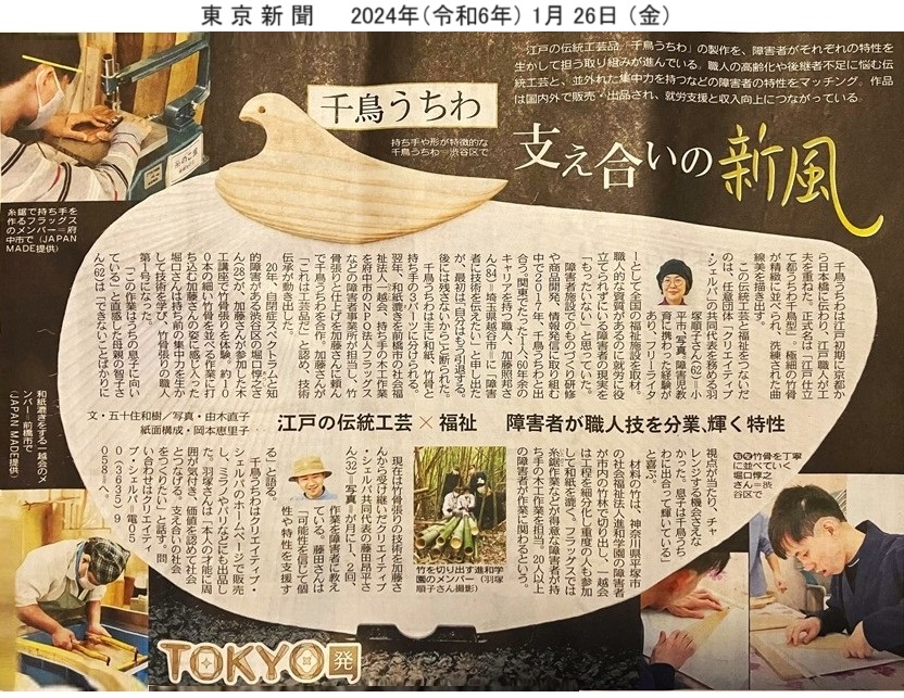 「千鳥うちわ」は、クリエイティブシェルパ(注)における「伝福連携」(伝統と福祉の連携)の取り組みとして、2020年度グッドデザイン賞も受賞し注目を集めていますが、東京新聞(2024年1月26日)が、障害のある方や福祉施設が協力して本取り組みに参画していることを報じています。進和学園による竹の切り出しについても写真入りで紹介されています。