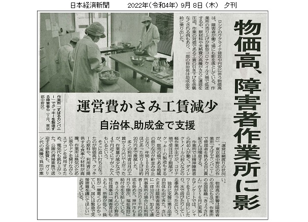 日本経済新聞「物価高、障害者作業所に影/運営費かさみ工賃減少)(2022.9.8)