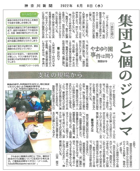 神奈川新聞「やまゆり園事件は問う・支援の現場から」~進和やましろホーム~(2022.6.8)