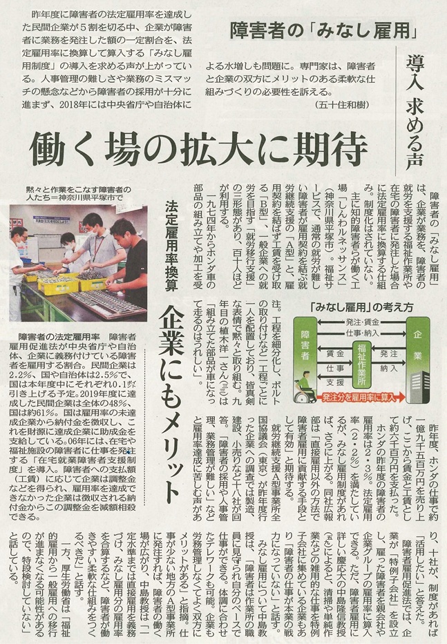 私達も、「みなし雇用」の導入を強く訴えていますが、この考え方を分かり易く図示して新聞紙上で取り上げて頂いたことを嬉しく思います。今後、法定雇用率の更なる引き上げが予定されている中で、直接雇用に加えて「みなし雇用」の導入により障害者の就労機会が拡充することを願って止みません。
