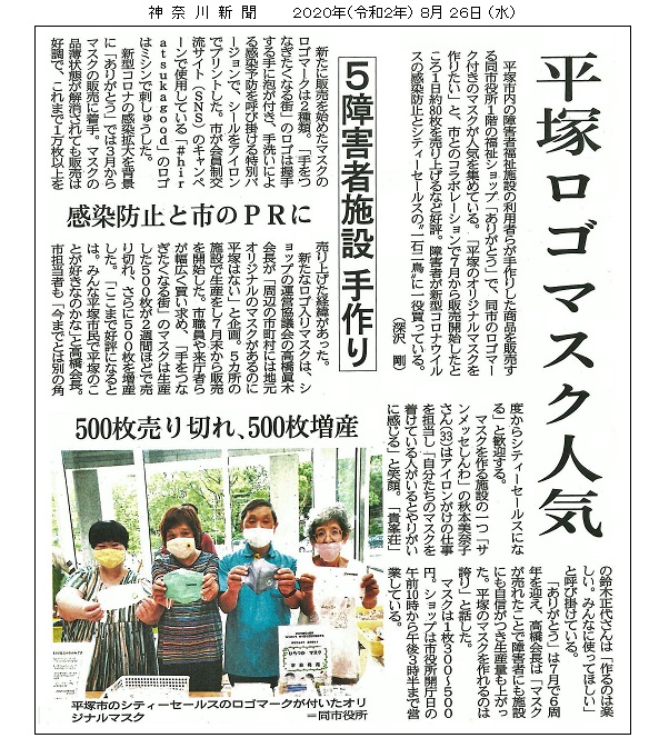 神奈川新聞「平塚ロゴマスク人気~感染防止と市のPRに~」(2020.8.26)