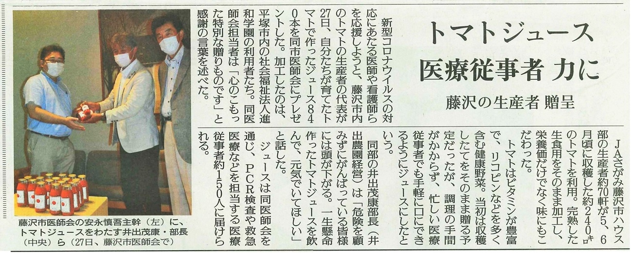 2020年7月27日、神奈川県藤沢市内のトマト生産者の代表が、自分達で育てたトマトで作ったトマトジュース840本を同市医師会にプレゼントされました。新型コロナウイルスの対応に当たる医師や看護師の方々を応援するためで、ジュースは、同医師会を通じてPCR検査や救急医療等を担当しておられる医療従事者約150人に届けられるそうです。