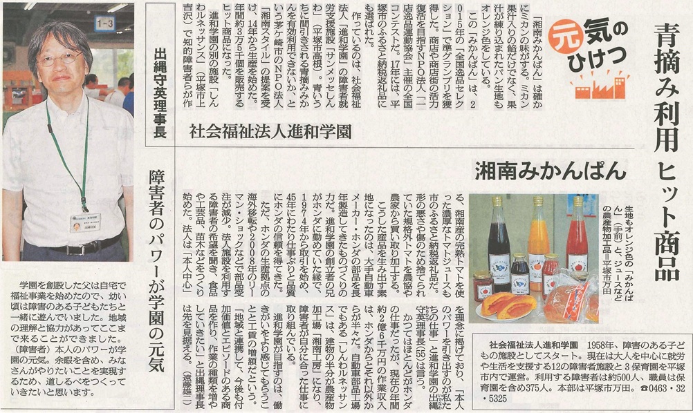 朝日新聞(2019年9月4日・朝刊)の「元気のひけつ」というコラム記事において、進和学園のヒット商品「湘南みかんぱん」(全国逸品セレクション準グランプリ獲得)、並びに湘南地区で栽培される「みかん」の摘果/青摘み果実や完熟の規格外トマトを利用した加工商品(ジュース等)が紹介されました。