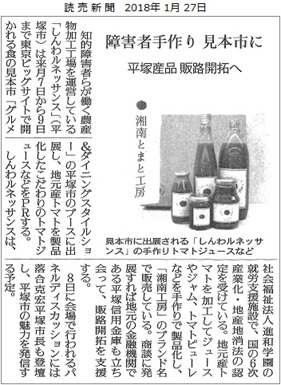 読売新聞(2018年1月27日)及び毎日新聞(2018年1月29日)が、「湘南とまと工房」が、2018年2月7日~9日、東京ビッグサイトで開催される見本市(グルメショー)の平塚市ブースに出展するなど、販路開拓に注力していることを報じています。