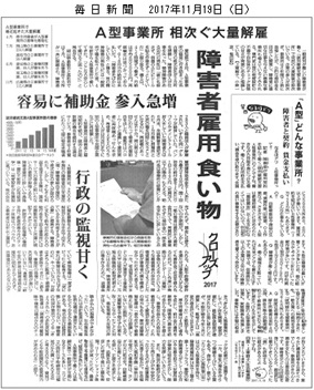 毎日新聞「A型事業所 相次ぐ大量解雇 障害者雇用食い物」(2017.11.19)