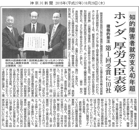 神奈川新聞「ホンダ 厚労大臣表彰/知的障害者就労支え40年超」(2015.10.29)