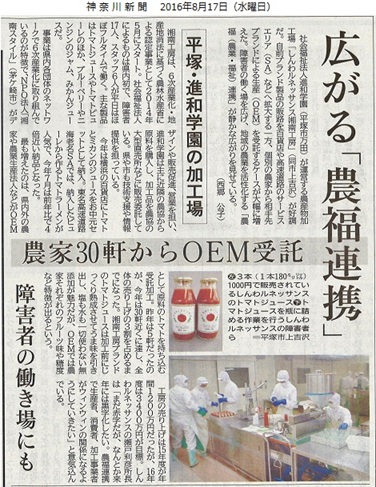 神奈川新聞「平塚・進和学園の加工場/農家30軒からOEM受託」(2016.8.17)
