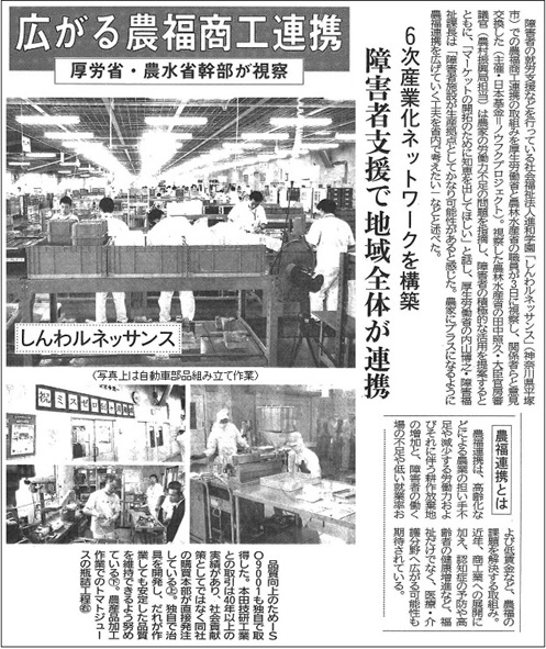進和学園「しんわルネッサンス」の農産物加工場「湘南工房」の取り組みをカラー写真入りで紹介。農福(農業と福祉)の連携の好事例として、自前ブランドのトマトジュースやピューレの他、個別の農家から相手先ブランドによる生産(OEM)を受託するケースが大幅に増えていること、障害者の働く場を広げ、地域の農業の活性化に繋がること等を報じています。