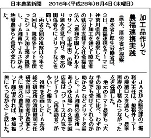 日本農業新聞「加工品作りで農福連携実践 農水・厚労省が視察」(2016.8.4)