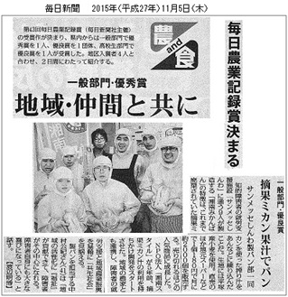 毎日新聞・朝日新聞「湘南みかんぱん 全国逸品準グランプリ受賞」(2015. 11/5・7&11/11)